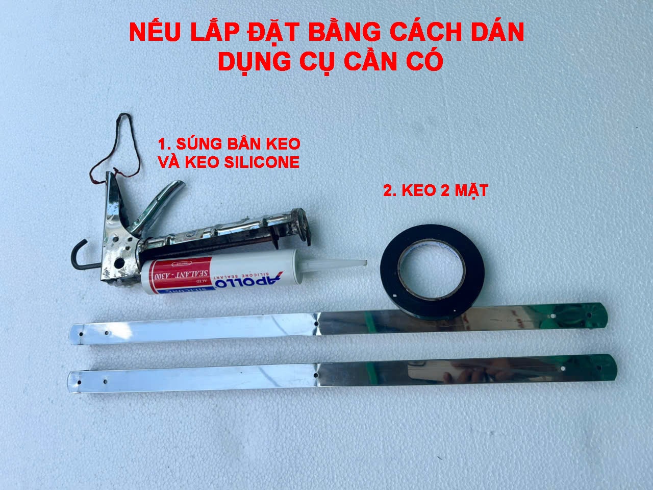 – Lắp bằng cách dán Quý Khách Hàng cần có súng bắn keo, keo silicone, và keo xốp 2 mặt. Dùng keo xốp dán vào 2 thanh inox, bắn keo silicone vào 2 thanh inox và tiến hành dán vào tường. thời gian keo khô là 4 tiếng, sau khi keo khô thì tiến hành bắt kệ kính vào 2 thanh.